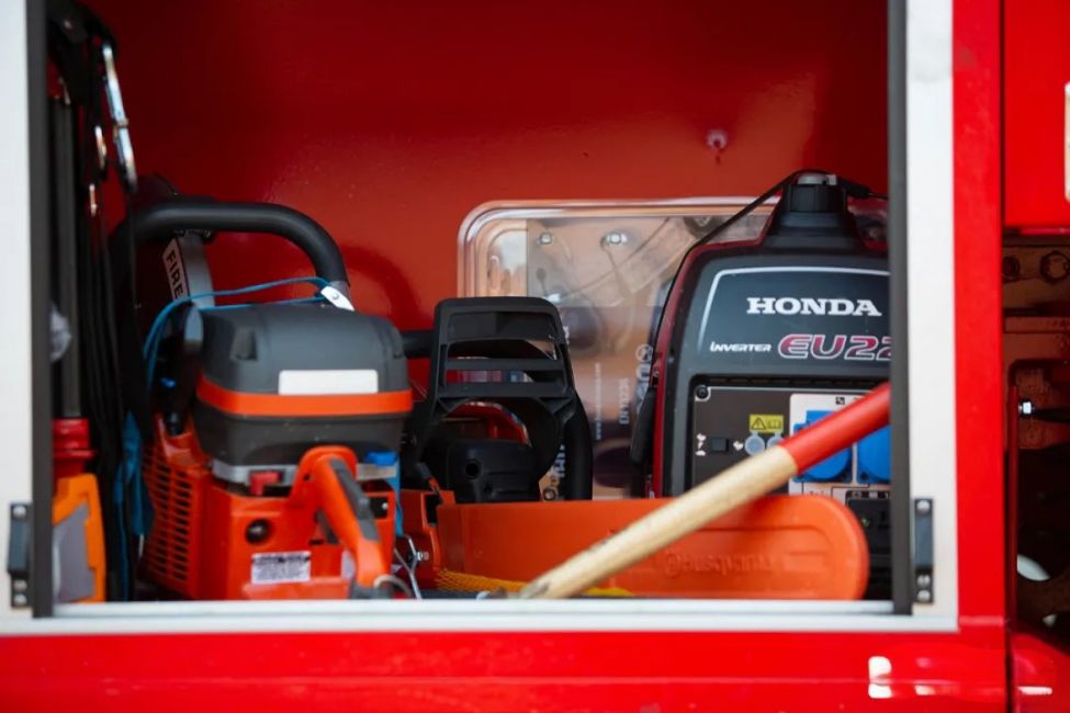 Khoang công cụ trên thân xe được trang bị các thiết bị cứu hộ như cưa xích, máy phát điện và nhiều thiết bị khác .