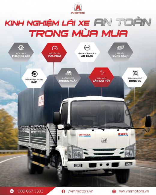 Mùa mưa thường gây ra trở ngại cho việc tham gia giao thông, đặc biệt là gây khó khăn cho người điều khiển ô tô và xe tải. Dưới đây là những kinh nghiệm VM MOTORS muốn chia sẻ đến các bác tài để di chuyển an toàn trên đường.
