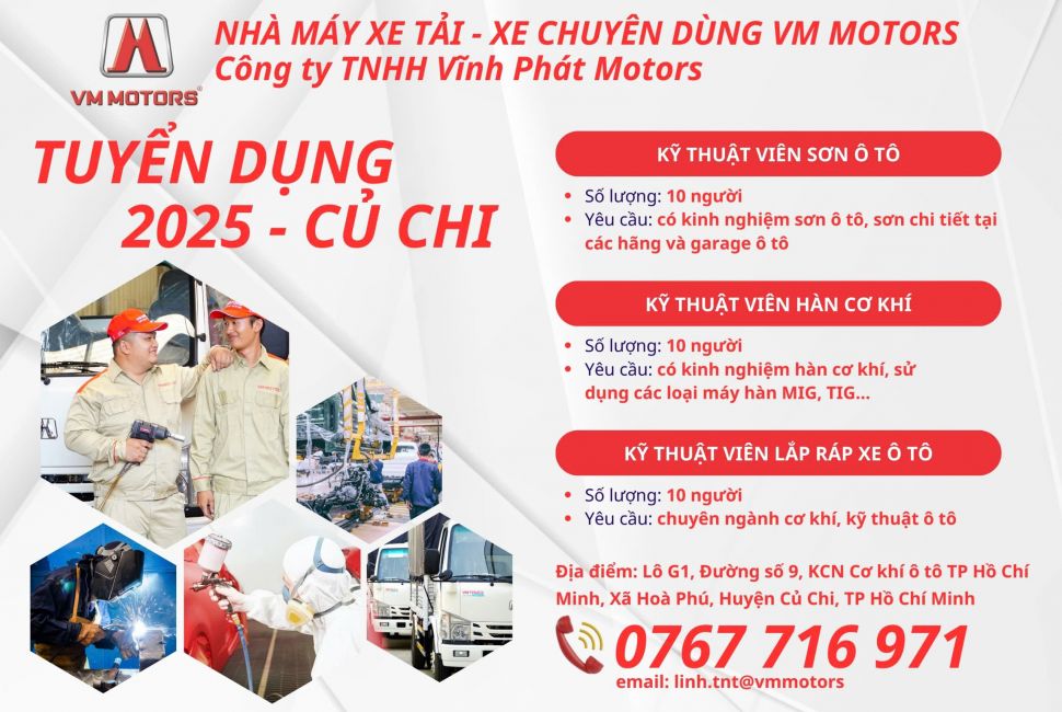 - Trực tiếp hồ sơ tại địa chỉ: NHÀ MÁY VĨNH PHÁT MOTORS - Lô G1, đường số 9, KCN cơ khí ô tô Tp.HCM, xã Hòa Phú, huyện Củ Chi, Tp.HCM – SĐT: 028.37979779.